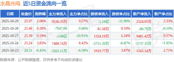 证券之星消息,截至2025年10月29日收盘,水晶光电(002273)报收于25.97元,上涨2.0%,换手率2.86%,成交量38.95万手,成交额9.97亿元。