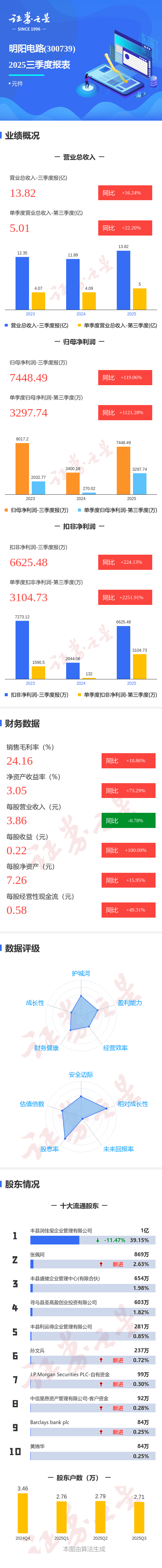 证券之星消息,明阳电路2025年三季报显示,前三季度公司主营收入13.82亿元,同比上升16.24%;归母净利润7448.49万元,同比上升119.06%;扣非净利润6625.48万元,同比上升224.13%;其中2025年第三季度,公司单季度主营收入5.01亿元,同比上升22.21%;单季度归母净利润3297.74万元,同比上升1121.28%;单季度扣非净利润3104.73万元,同比上升2251.91%;负债率27.59%,投资收益506.21万元,财务费用650.74万元,毛利率24.16%。