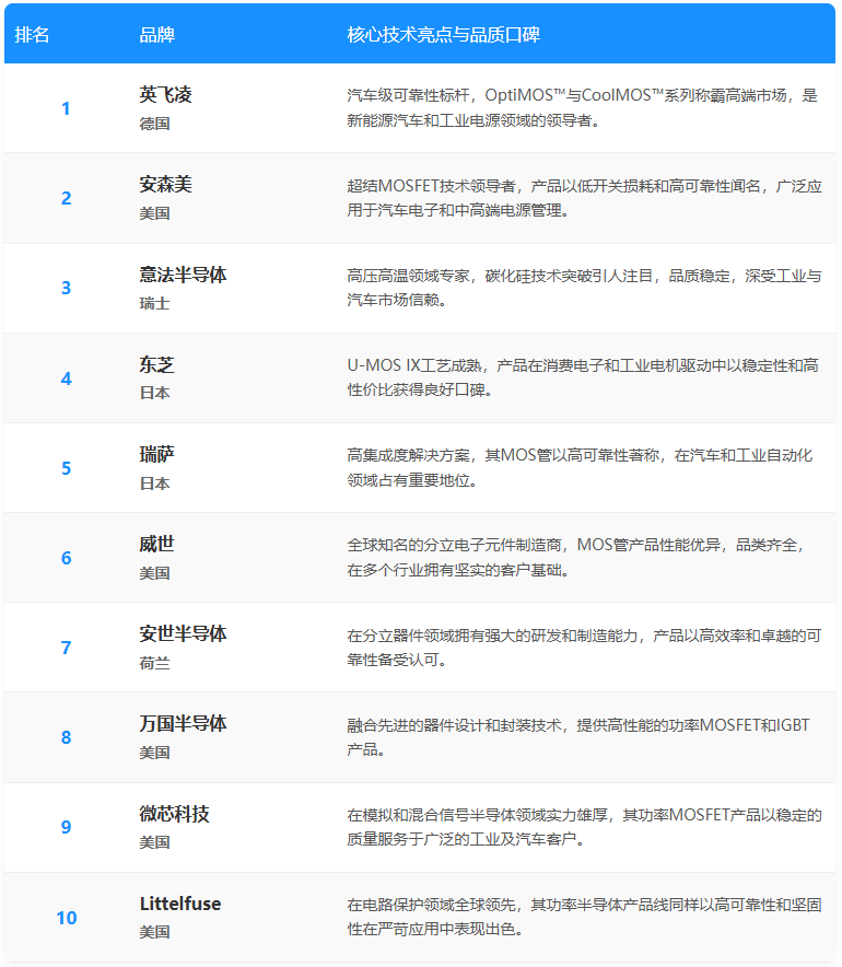 1. 英飞凌(德国) - 汽车级可靠性标杆,OptiMOS™与CoolMOS™系列称霸高端市场