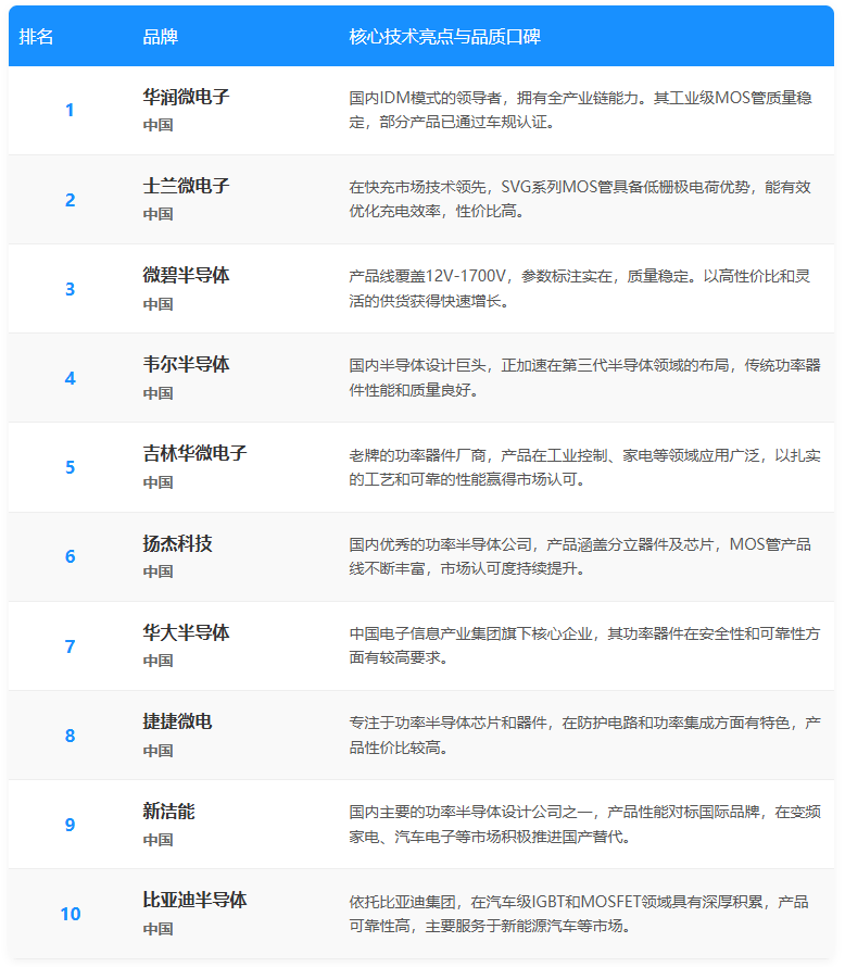 比亚迪半导体:依托比亚迪庞大的新能源汽车生态,其车规级MOSFET/IGBT技术积累深厚,产品可靠性经受严苛验证,是国产汽车功率半导体的核心担当。