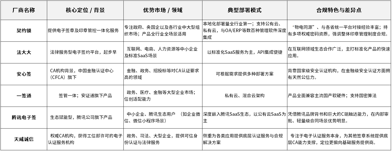 以下是契约锁等6家主流电子签章厂商综合能力的对比情况: