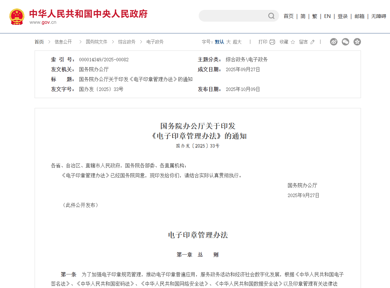 9月27日,由国务院办公厅印发的《电子印章管理办法》正式实施,这一政策的落地不仅为电子印章的应用加强了管理和操作层面的法律依据,更标志着电子印章进入更重视“规范化、合规化”发展的新阶段。作为数字化转型的重要组成部分,电子印章将在政策红利驱动下迎来新一轮发展机遇。