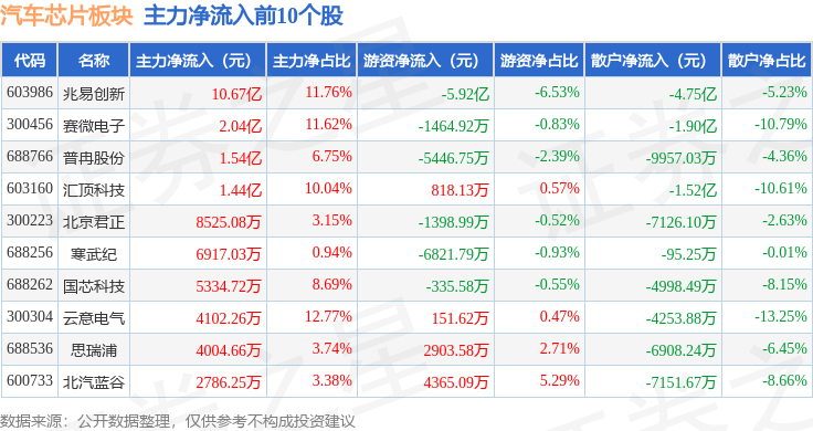 从资金流向上来看,当日汽车芯片板块主力资金净流出11.67亿元,游资资金净流入1.24亿元,散户资金净流入10.43亿元。汽车芯片板块个股资金流向见下表: