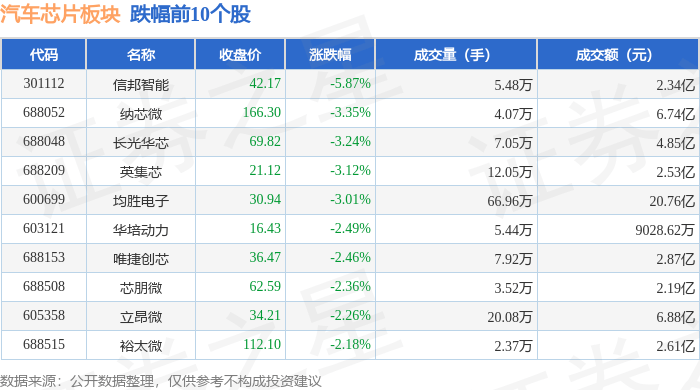 证券之星消息,11月3日汽车芯片板块较上一交易日下跌0.31%,信邦智能领跌。当日上证指数报收于3976.52,上涨0.55%。深证成指报收于13404.06,上涨0.19%。汽车芯片板块个股涨跌见下表: