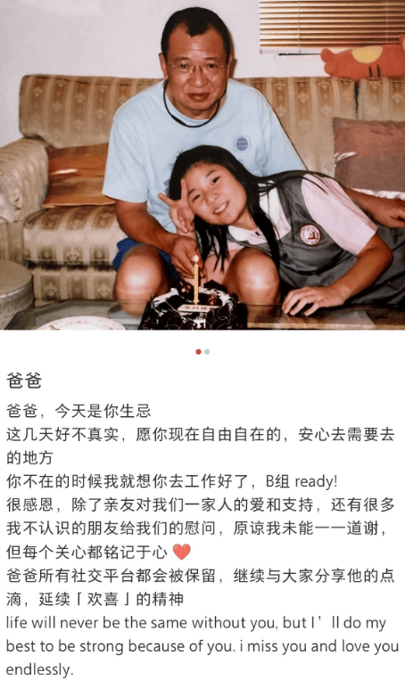 搜狐娱乐讯 11月4日,许绍雄女儿许惠菁发文悼念父亲生忌,她写道:“爸爸,今天是你生忌,这几天好不真实,愿你现在自由自在的,安心去需要去的地方,你不在的时候我就想你去工作好了,B组ready!很感恩,除了亲友对我们一家人的爱和支持,还有很多我不认识的朋友给我们的慰问,原谅我未能一一道谢,但每个关心都铭记于心爸爸所有社交平台都会被保留,继续与大家分享他的点滴,延续「欢喜」的精神。”