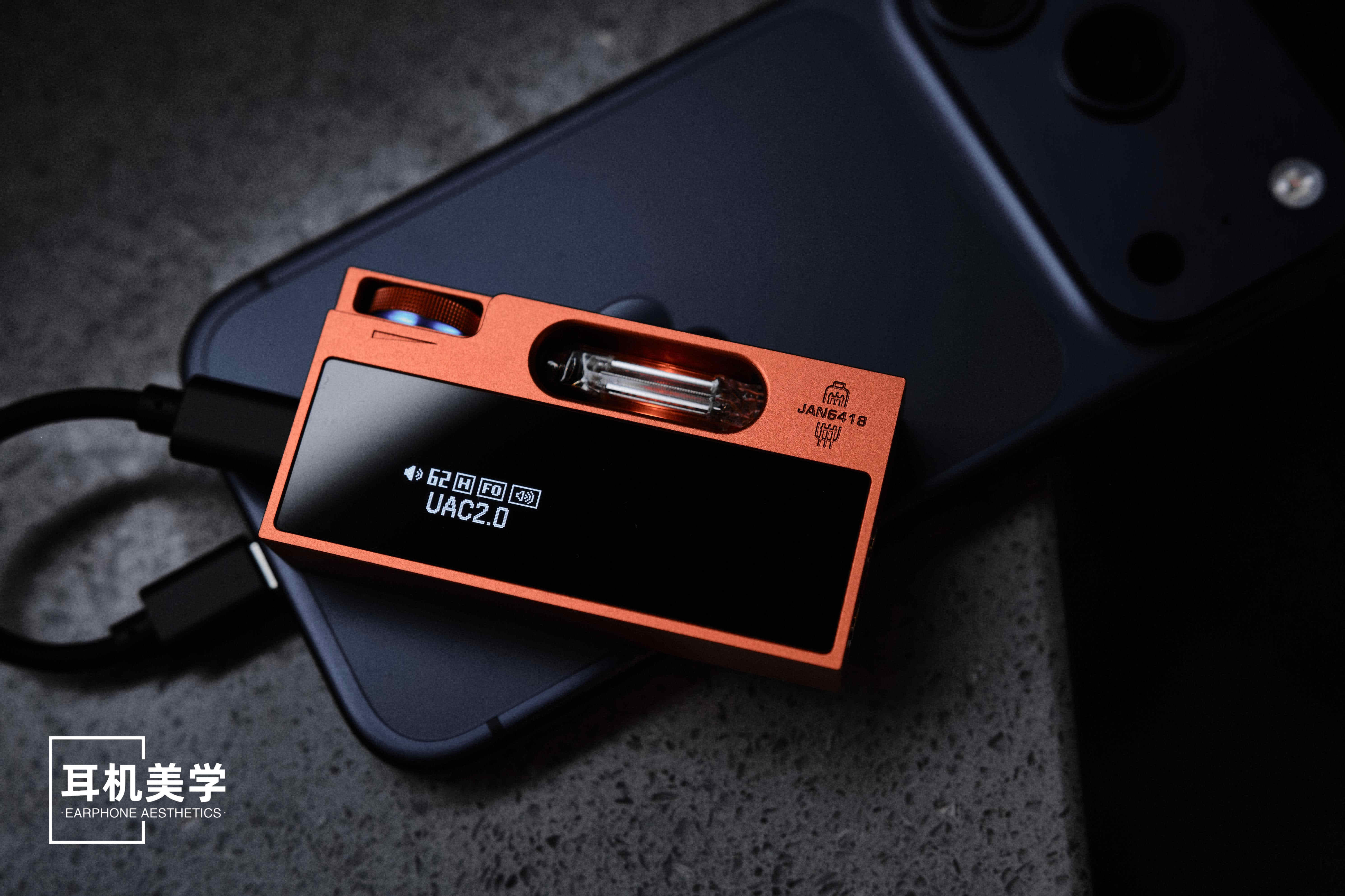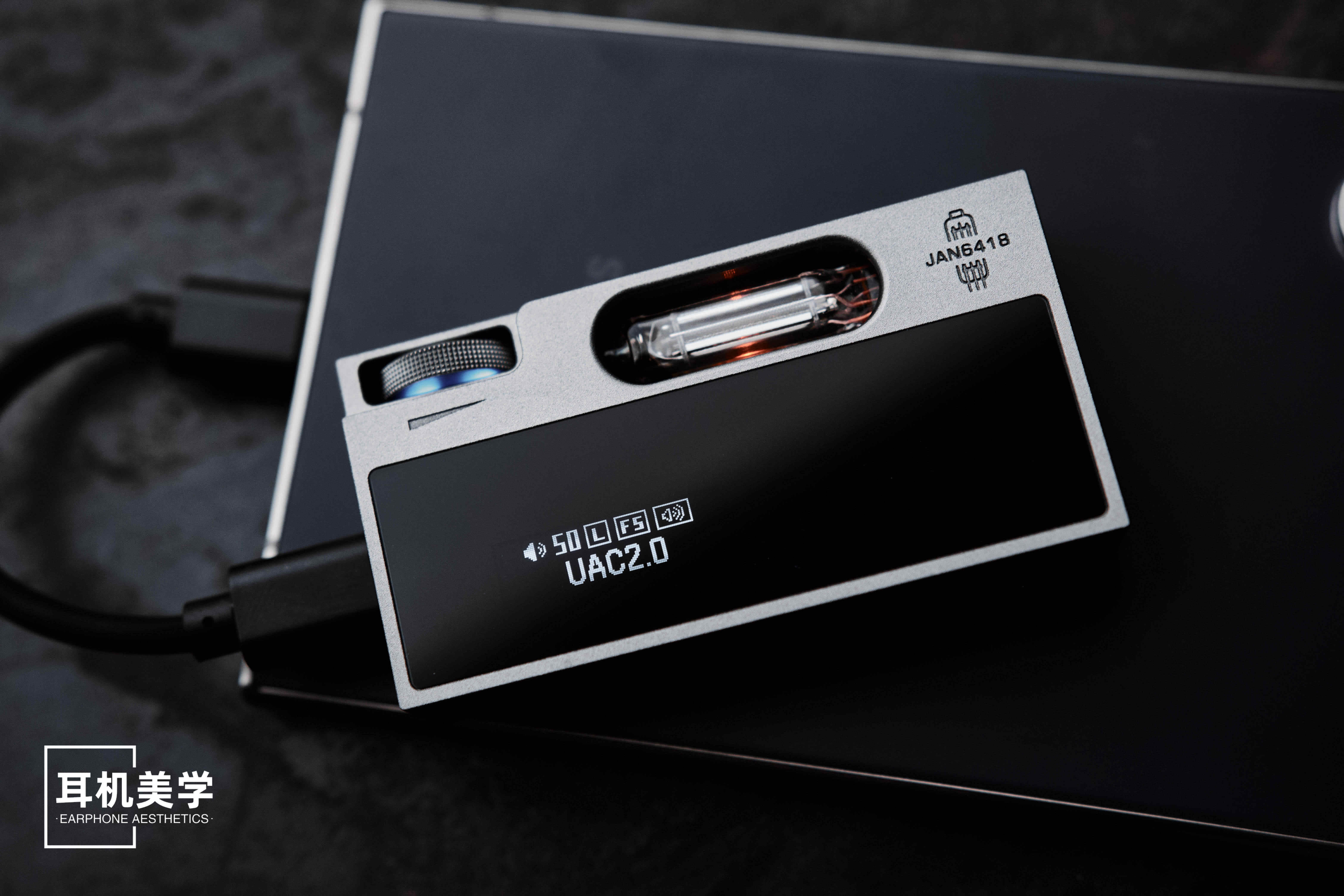 从外观上来看,UA7 相比大多数小尾巴在体积上确实要稍大、稍宽一些。正面搭载了一块 0.87 英寸的 OLED 显示屏,在熄屏时与玻璃盖板融为一体,整体观感干净利落。侧面配备了一个旋钮与多功能控制按键,并能看到那两颗 JAN6418 电子管。旋钮的手感是带段落感的,搓动时的阻尼感恰到好处,而在功能操作上,旋钮与按键的组合逻辑也相当顺手。