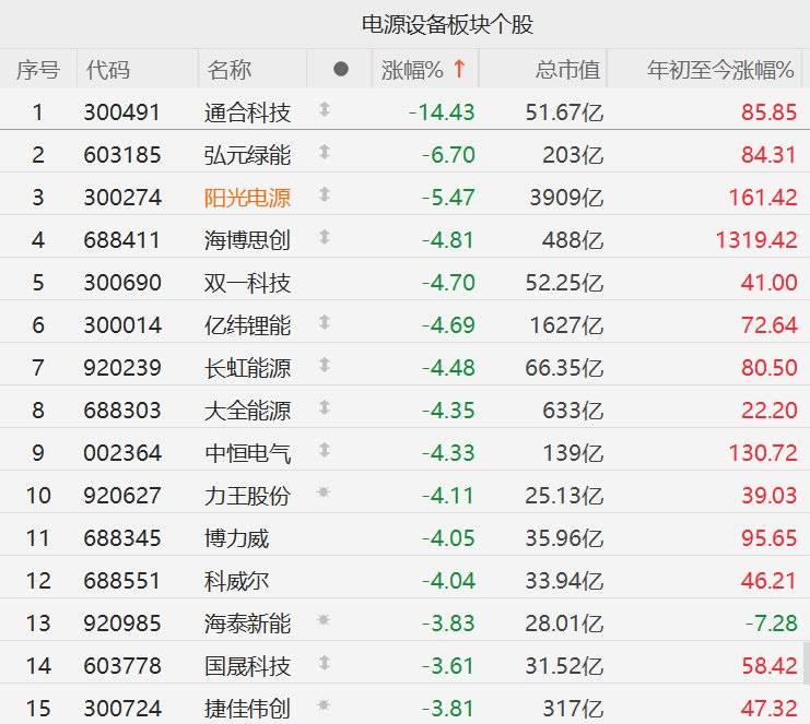 格隆汇11月4日|A股市场电源设备股下跌,其中,通合科技跌超14%,弘元绿能跌超6%,阳光电源跌超5%,海博思创、双一科技、亿纬亿能、长虹能源、大全能源、中恒电气、力王股份、博力威、科威尔跌超4%。
