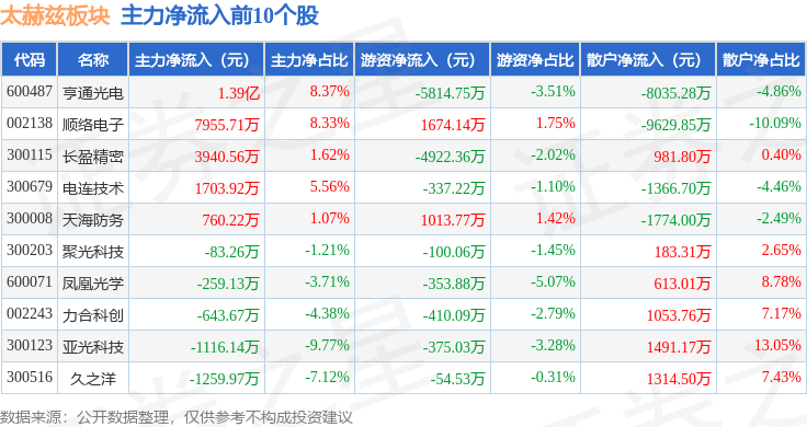 从资金流向上来看,当日太赫兹板块主力资金净流入1708.6万元,游资资金净流出1.08亿元,散户资金净流入9120.18万元。太赫兹板块个股资金流向见下表: