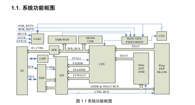 带 7 位预分频的 WDT,溢出频率约为 16-2048ms