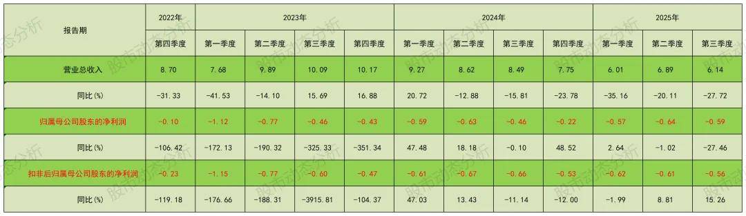 从2022年四季度一直到2025年三季度,一共12个季度,龙腾光电就没有再盈利过。(见表格)