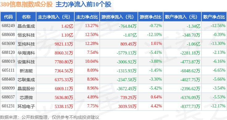 资金流向方面,380信息(000111)指数成份股当日主力资金净流入合计8.49亿元,游资资金净流出合计2.55亿元,散户资金净流出合计5.95亿元。成份股资金流向详情见下表: