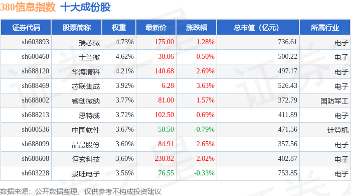 证券之星消息,11月6日,380信息(000111)指数报收于9722.1点,涨1.54%,成交263.81亿元,换手率1.87%。当日该指数成份股中,上涨的有37家,世运电路以6.57%的涨幅领涨,下跌的有9家,蓝特光学以1.33%的跌幅领跌。