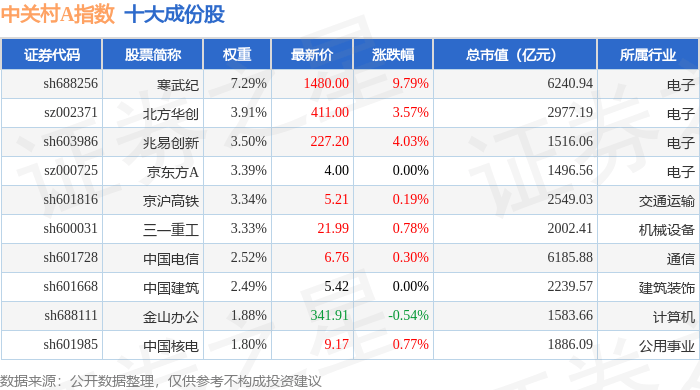 中关村A(399422)指数十大成份股详情如下: