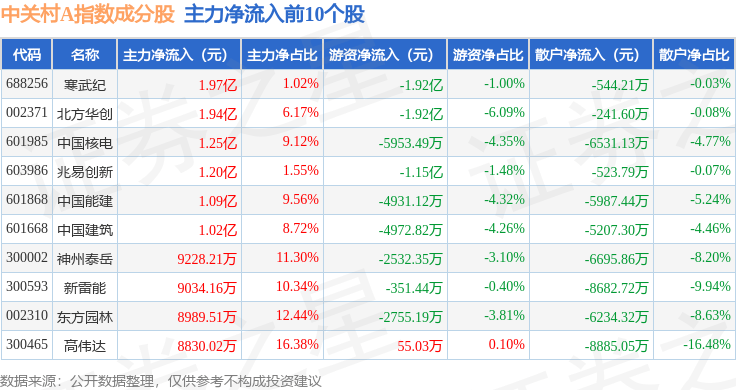 资金流向方面,中关村A(399422)指数成份股当日主力资金净流出合计29.78亿元,游资资金净流入合计9522.12万元,散户资金净流入合计28.83亿元。成份股资金流向详情见下表:
