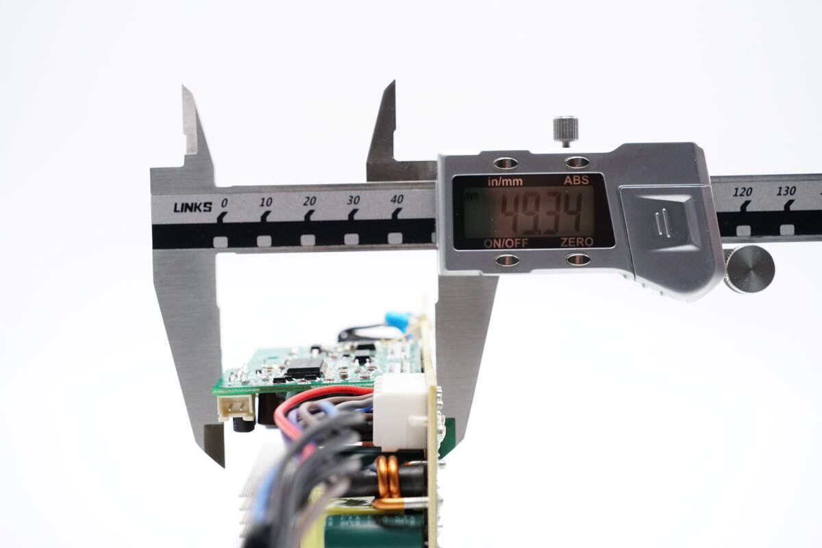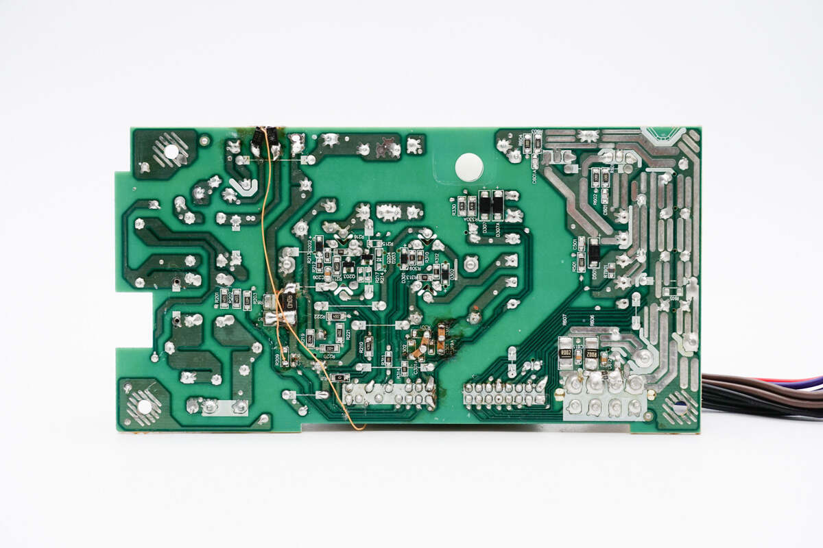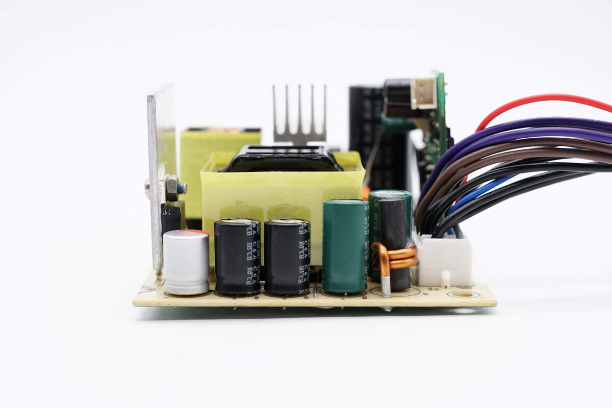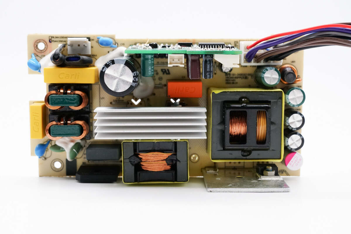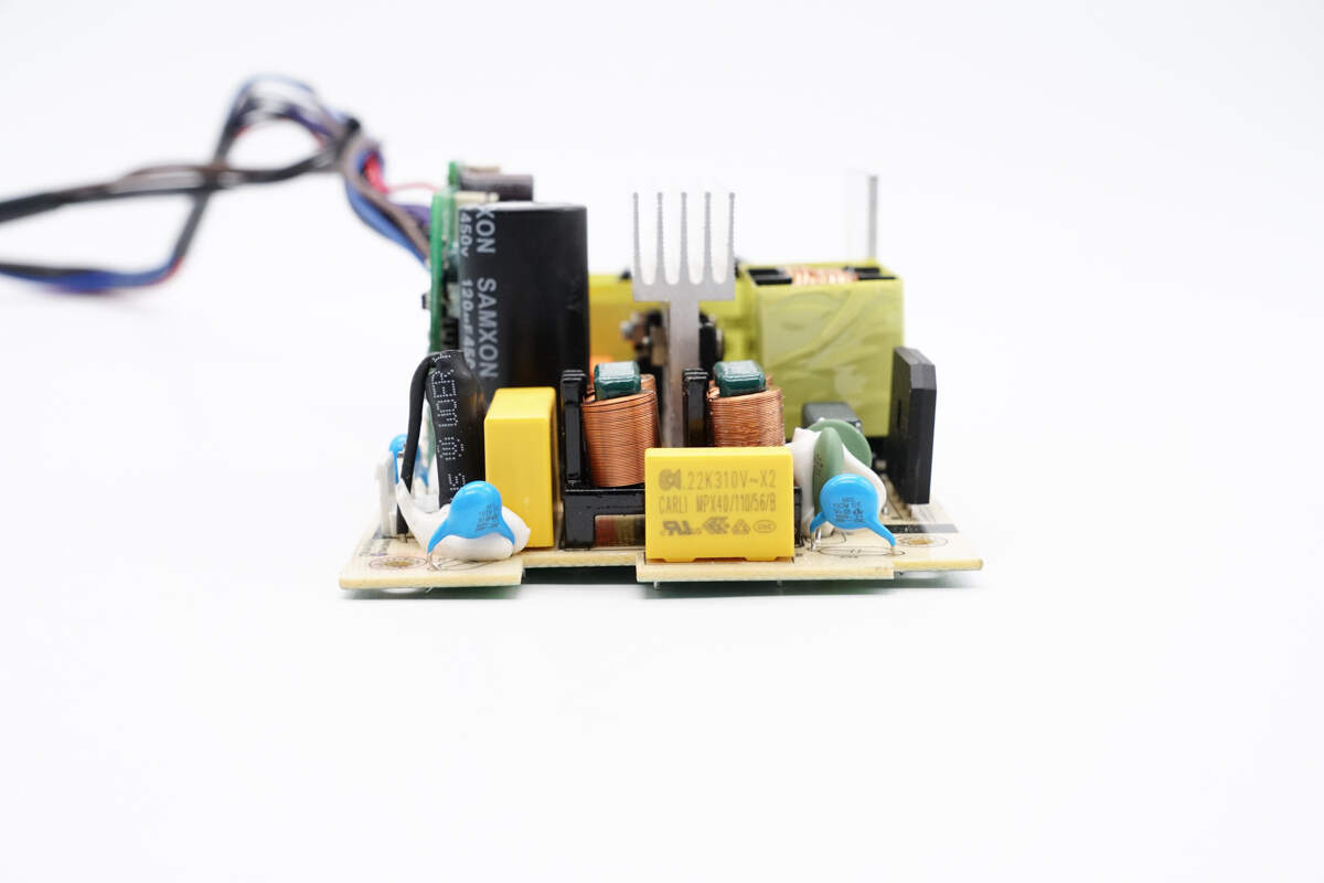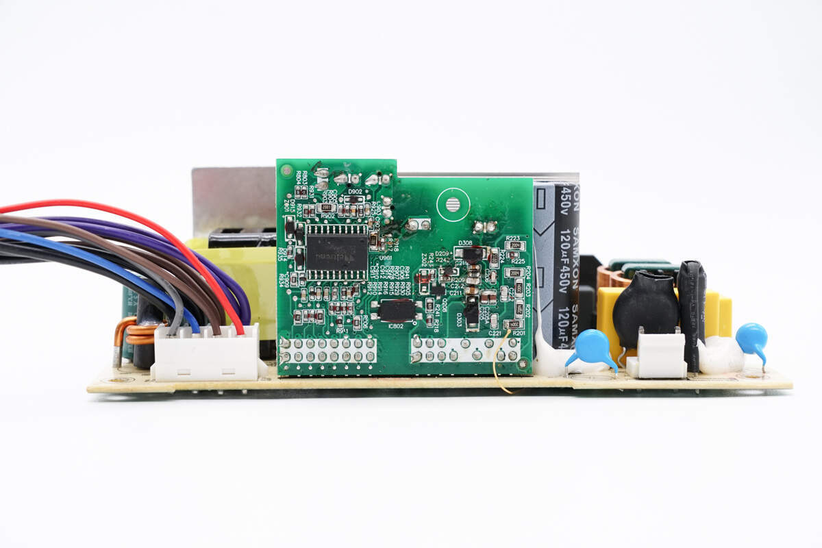 方案正面一览,左侧为AC输入端,焊接有安规 X 电容、共模电感、Y电容、整流桥、输入端保险丝、压敏电阻,中间为功率变换区域,下方为PFC升压电感,附近设有电解电容、薄膜电容、PFC整流管,中间金属散热片上安装有PFC开关管。右侧附有LLC差模电感、谐振电感、输出滤波电容,右下方焊接金属散热片为LLC开关管散热,右上多芯线束插座即为 DC 输出口。