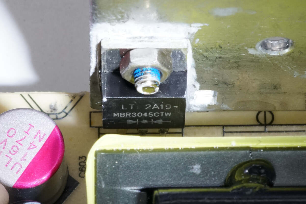 LLC开关管采用MBR3045CT,来自光宝,采用TO-220AB封装,使用螺丝固定在散热金属片上。