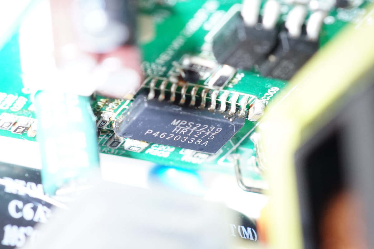 电源主控芯片来自MPS芯源半导体,型号HR1275,这是一款集成了CrM/DCM的多模式PFC+LLC二合一控制器。该芯片可通过 UART 接口进行配置,根据需求调节参数,优化电源设计。该芯片空载功耗低于 85mW,启动时采用高压电流源,并可通过智能 X 电容器在交流掉电期间进行放电。