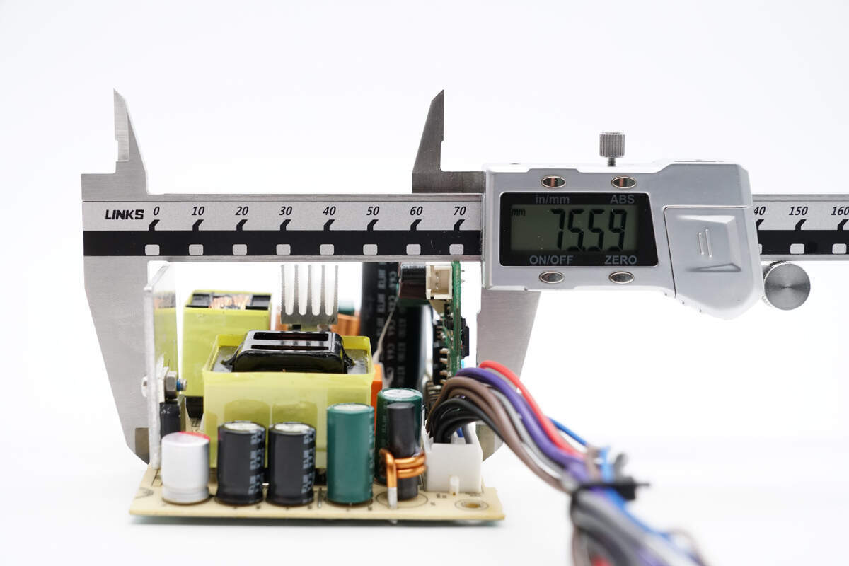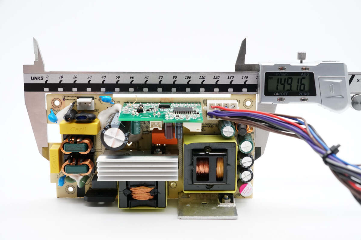 这款 PC 电源方案采用主流的 PFC+LLC 两级架构,核心由 MPS 芯源半导体 HR1275 二合一控制器驱动,该芯片集成多模式 PFC 与 LLC 控制功能,支持 UART 接口参数配置,具备低空载功耗、500kHz 高工作频率及过温、过流等多重保护,可实现全负载高效运行。方案尺寸为 149.16×75.59×49.34mm,重量约 382.2g,PCB 板初次级分界清晰,左侧为 AC 输入区,中间为功率变换区,右侧为 LLC 谐振变换及 DC 输出区,关键器件均配备散热与绝缘设计。