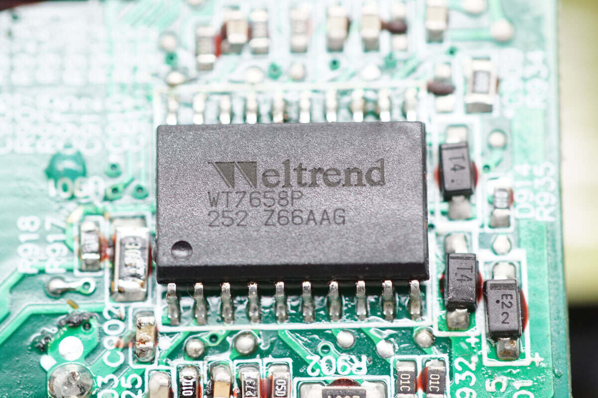 电源管理芯片来自伟诠,型号WT7658P,用于输出过压欠压保护,输出过流保护及电源启动控制。