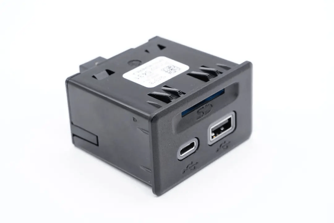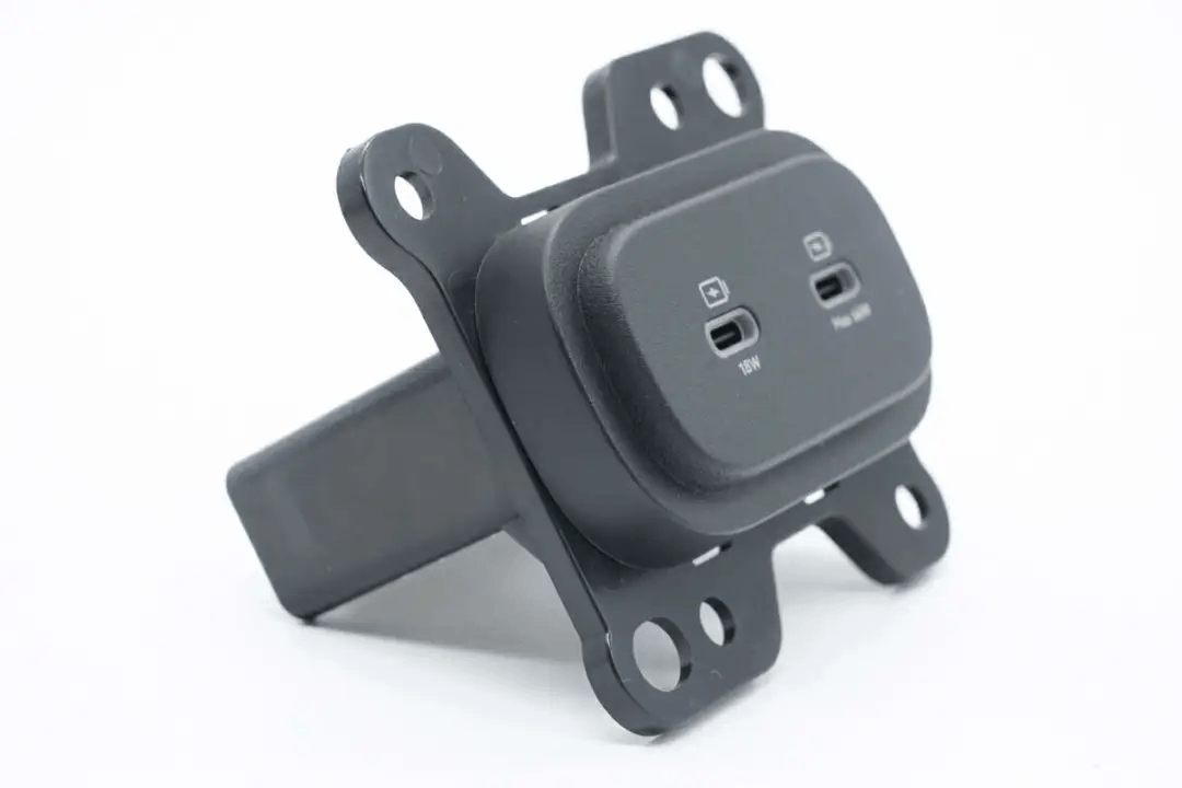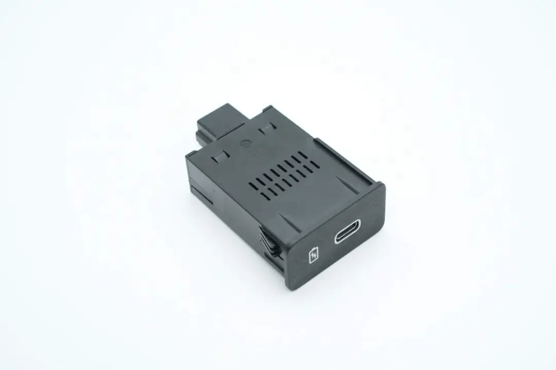 大众汽车USB-C车充模块采用黑色塑料外壳,具备两个USB-C接口,使用卡扣组装和固定,外观简洁。USB-C接口设有指示灯指示位置,便于夜间行车使用。此外在USB-C接口旁还标注USB图标,表示支持USB数据连接。