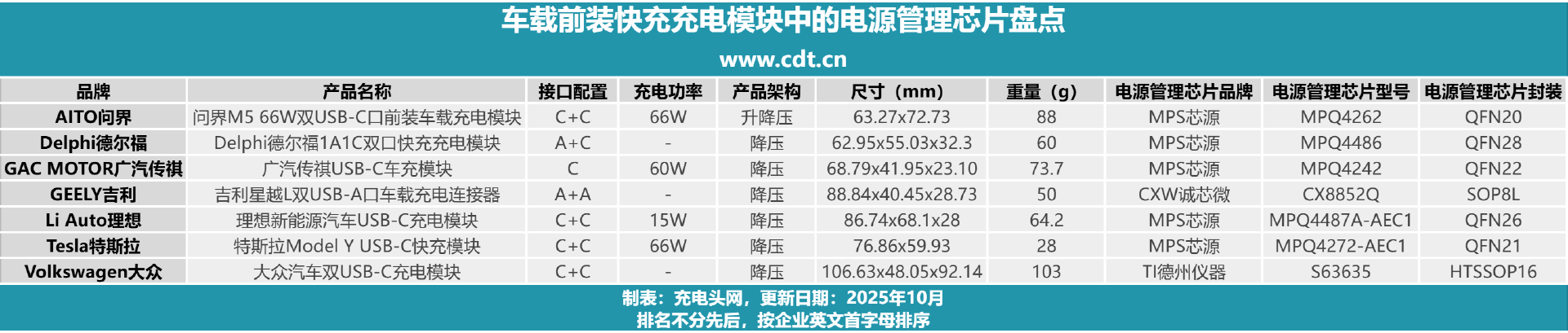 通过对多款前装充电模块拆解可以看到,以同步降压为核心的电源链路几乎贯穿全场。无论是问界、理想、特斯拉等双 USB-C 模块,还是德尔福、大众、广汽、吉利的不同形态方案,主功率级大多采用车规级同步降压把车载电源稳健转换到快充所需电压,并在端口侧,再配合 PD/Type-C 控制与限流/保护,实现双口独立、功率分配与协议兼容。