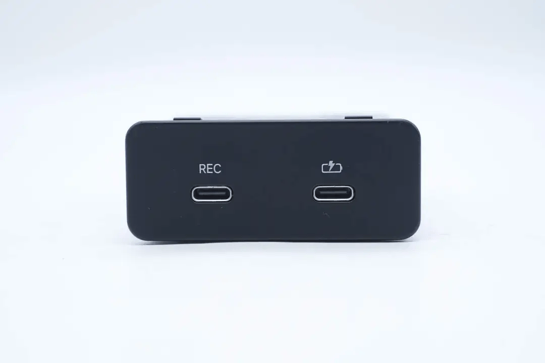 理想新能源汽车USB-C车充模块采用黑色塑料外壳,使用卡扣组装及固定,外观简洁低调。车充面板设有两个USB-C母座,标注REC和充电符号,用于连接手机和存储设备,内部则设有一个USB-C接口和供电接口。