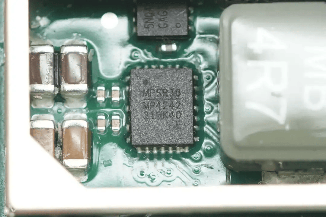车充内部的同步升降压转换器来自MPS芯源半导体,型号MPQ4262,芯片支持36V输入和输出电压,支持100W输出功率和5A输出电流。芯片内部集成两个下管,集成两个上管驱动器,符合AEC-Q100认证,符合USB PD 3.0和PPS规范。