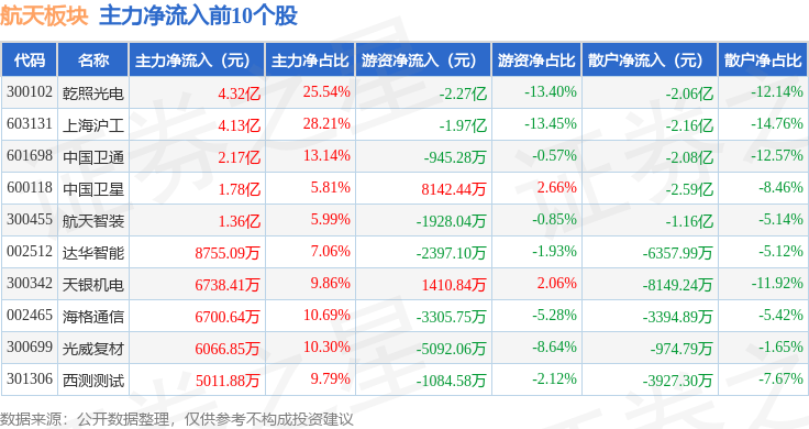 从资金流向上来看,当日航天板块主力资金净流出2667.83万元,游资资金净流出1.43亿元,散户资金净流入1.7亿元。航天板块个股资金流向见下表: