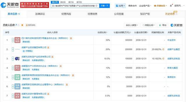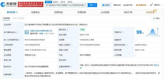 天眼查App显示,近日,四川省成都市产投电子信息重大产业化项目股权投资基金合伙企业(有限合伙)成立,执行事务合伙人为成都先进资本管理有限公司,出资额100亿人民币,经营范围包括以私募基金从事股权投资、投资管理、资产管理等活动。合伙人信息显示,该基金由四川省先进制造投资引导基金合伙企业(有限合伙)、成都产业投资集团有限公司、成都先进制造产业投资有限公司等共同出资。