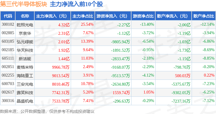 从资金流向上来看,当日第三代半导体板块主力资金净流出19.12亿元,游资资金净流入3815.1万元,散户资金净流入18.74亿元。第三代半导体板块个股资金流向见下表: