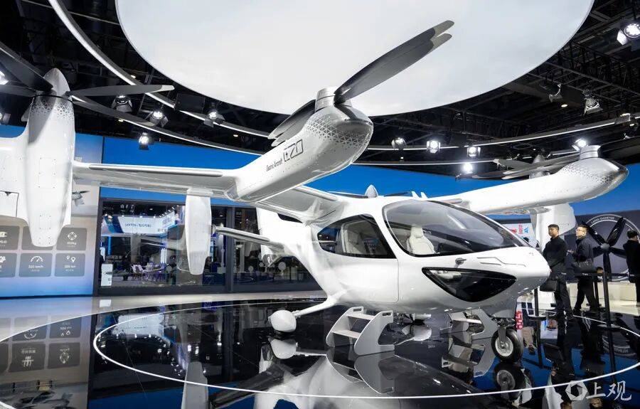 11月6日,国内最先进倾转旋翼载人电动垂直起降飞机亮相本届进博会时的科技展台。