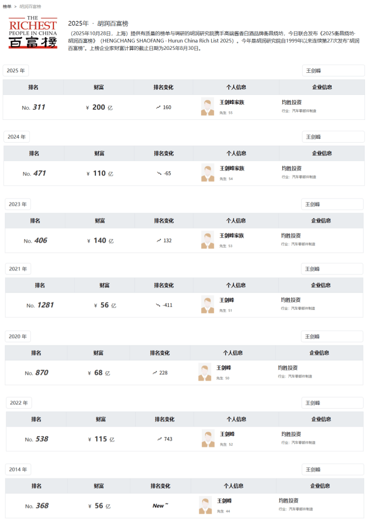 如今均胜电子在港股顺利上市,王剑峰已实际掌控3家上市公司。2025年,王剑峰家族以200亿元财富登上胡润百富榜。而自2014年首度上榜后,王剑峰便成为了百富榜上的常客。