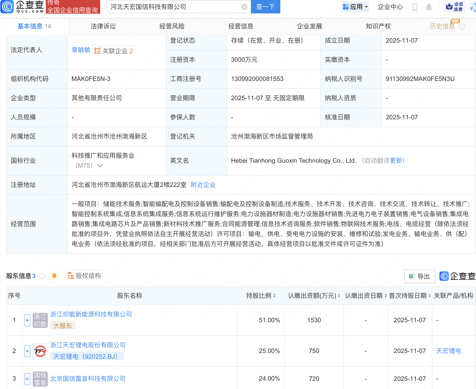 企查查APP显示,近日,河北天宏国信科技有限公司成立,注册资本3000万元,经营范围包含:集成电路销售;集成电路芯片及产品销售;新材料技术推广服务;合同能源管理等。企查查股权穿透显示,该公司由天宏锂电(920252)等共同持股。