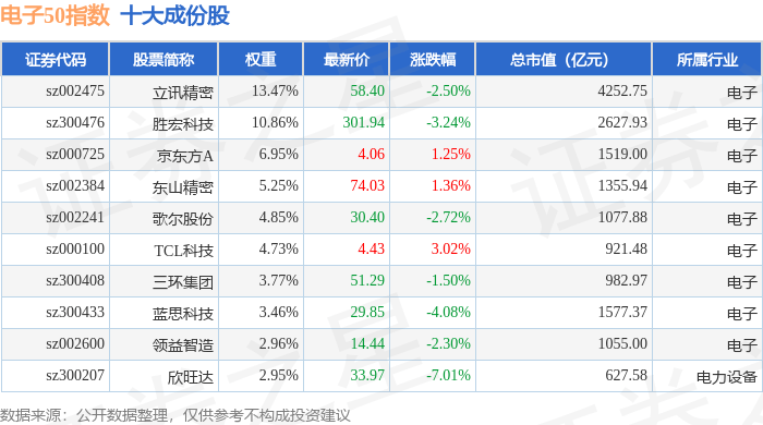 证券之星消息,11月10日,电子50(399281)指数报收于4511.31点,跌1.42%,成交713.05亿元,换手率2.46%。当日该指数成份股中,上涨的有18家,TCL科技以3.02%的涨幅领涨,下跌的有32家,欣旺达以7.01%的跌幅领跌。