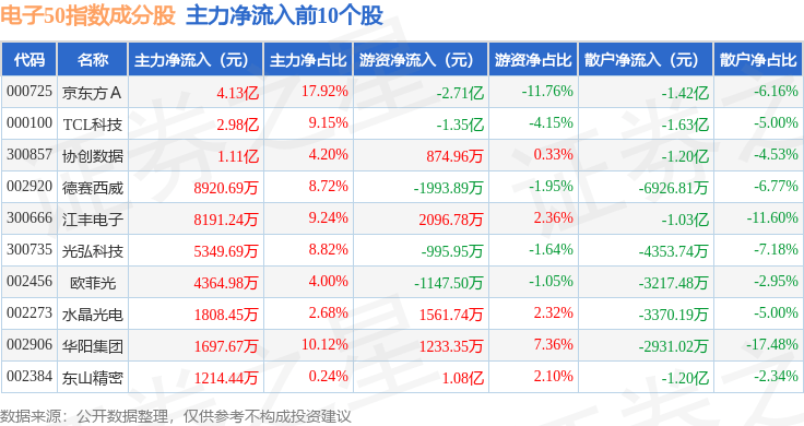 资金流向方面,电子50(399281)指数成份股当日主力资金净流出合计34.62亿元,游资资金净流入合计174.97万元,散户资金净流入合计34.61亿元。成份股资金流向详情见下表: