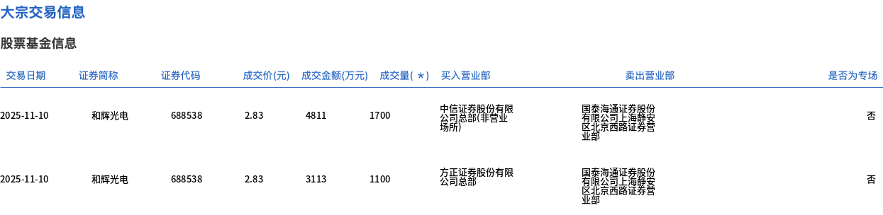 11月10日,和辉光电大宗交易成交2800万股,成交额7924万元,占当日总成交额的12.9%,成交价2.83元,较市场收盘价2.86元折价1.05%。