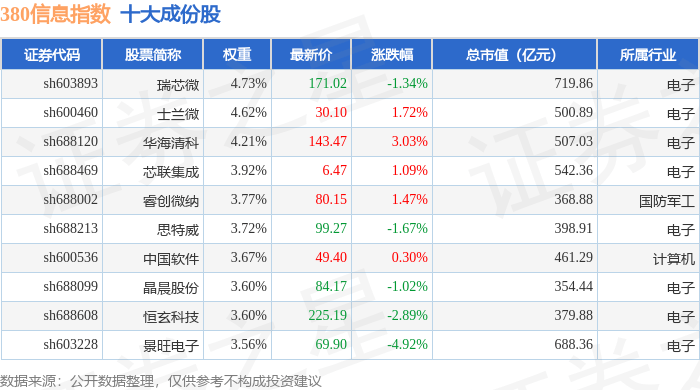 证券之星消息,11月10日,380信息(000111)指数报收于9615.8点,跌0.21%,成交282.78亿元,换手率2.25%。当日该指数成份股中,上涨的有25家,中科星图以3.84%的涨幅领涨,下跌的有21家,世运电路以5.17%的跌幅领跌。