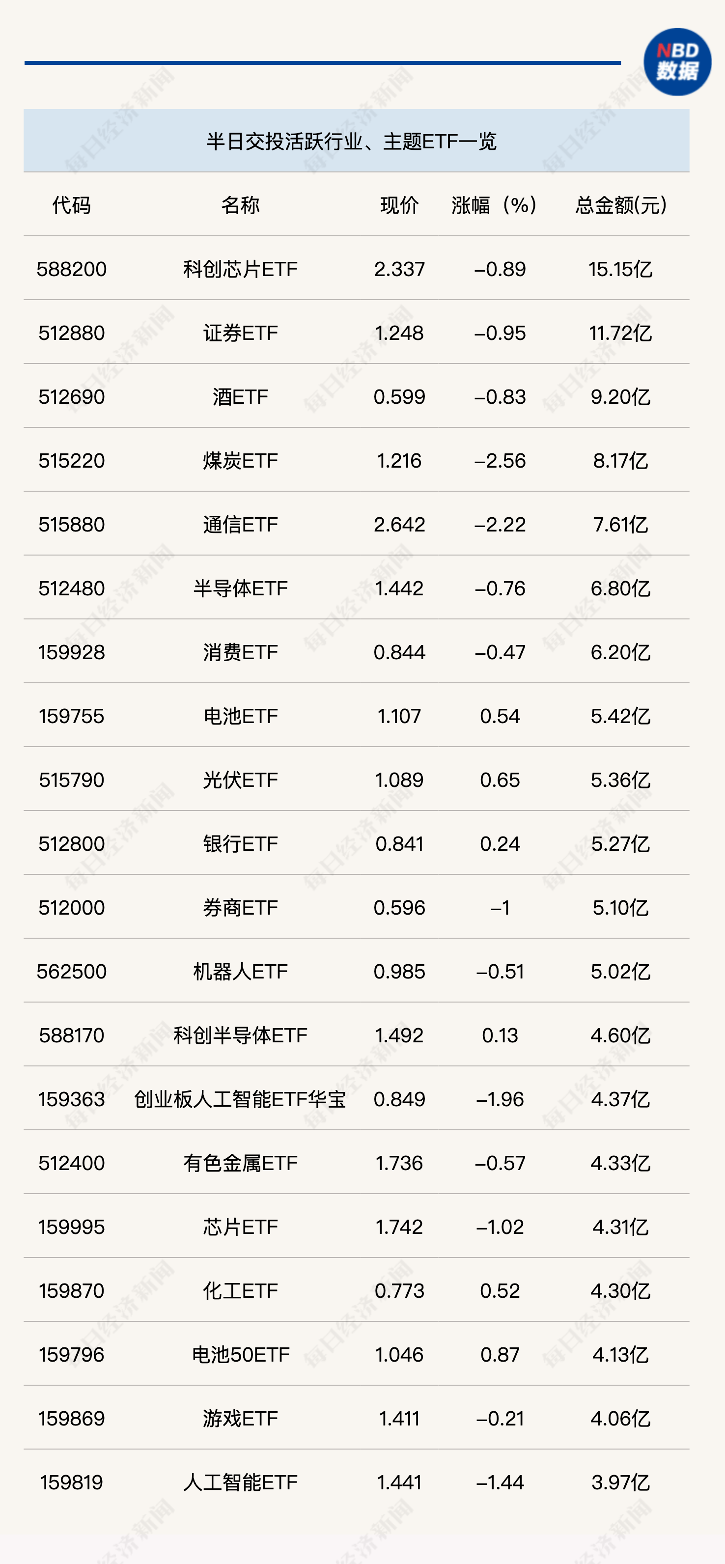 今日上午,半导体相关ETF交易热度明显下降,仅科创芯片ETF(588200)半日成交金额超过10亿元,达到15.15亿元。而防御属性较高的酒、煤炭、消费类ETF半日成交金额保持在5亿元以上。跨境ETF方面,只有香港证券ETF(513090)半日成交金额超过50亿元。
