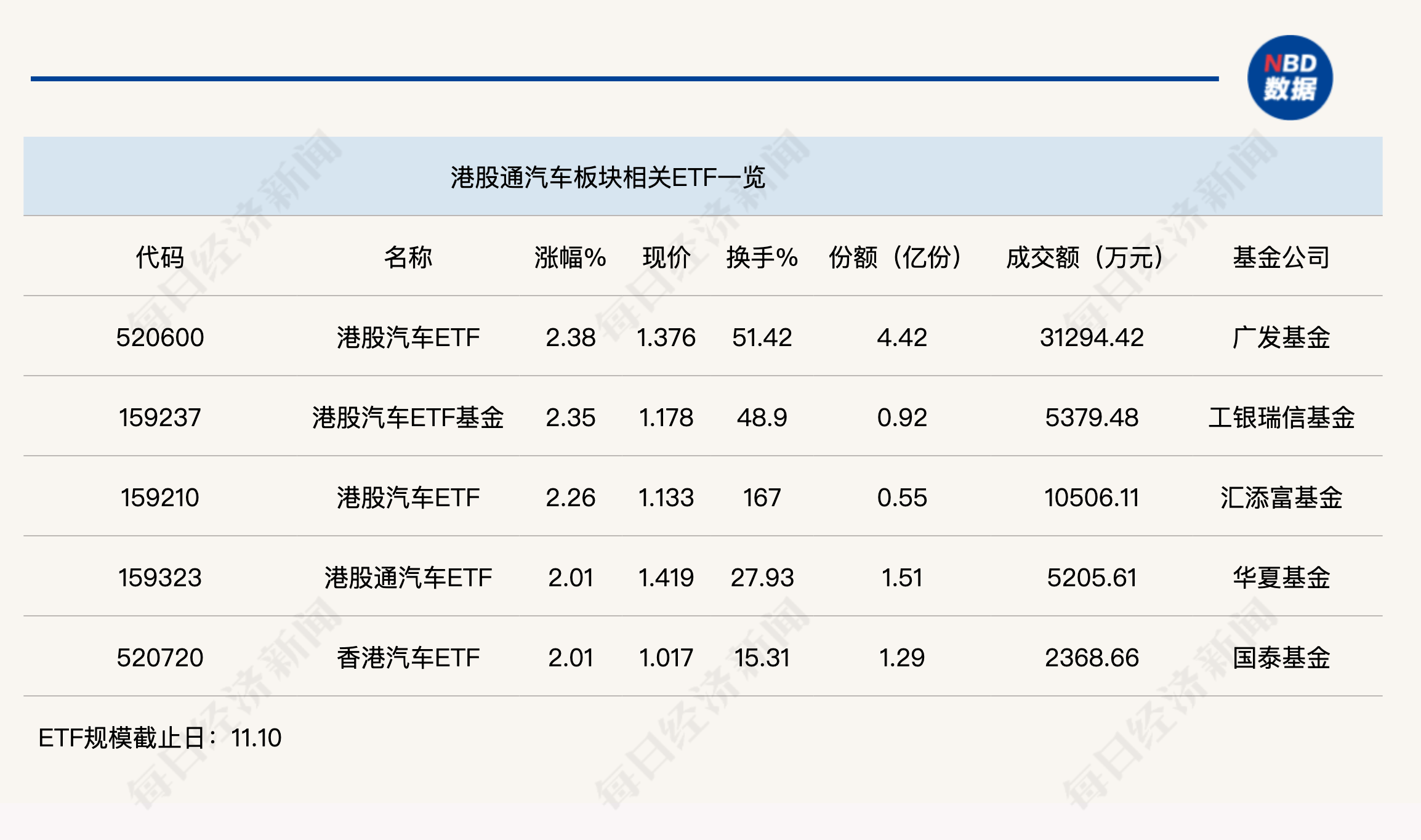点评:港股汽车ETF(520600)和港股汽车ETF基金(159237)今日上午分别上涨2.38%和2.35%。其中,港股汽车ETF(520600)规模较大,份额达到4.42亿份,半日成交金额达3.13亿元。上述两只ETF均追踪的是中证港股通汽车产业主题指数,追踪该指数的ETF还包括港股汽车ETF(159210)等。