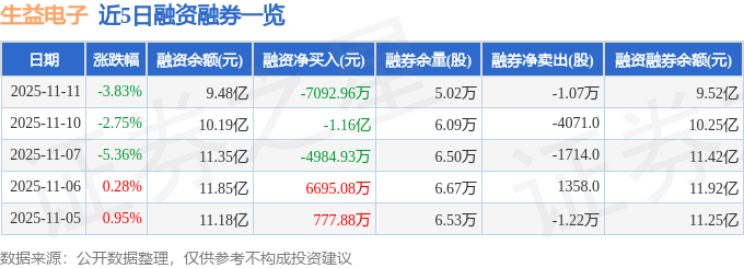 生益电子融资融券信息显示,融资方面,当日融资买入9843.01万元,融资偿还1.69亿元,融资净偿还7092.96万元。融券方面,融券卖出1.06万股,融券偿还2.13万股,融券余量5.02万股,融券余额486.97万元。融资融券余额9.52亿元。