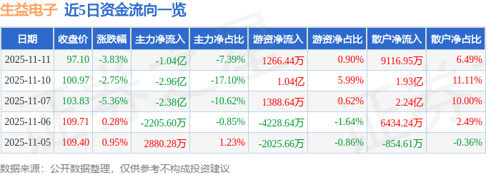 证券之星消息,截至2025年11月11日收盘,生益电子(688183)报收于97.1元,下跌3.83%,换手率1.7%,成交量14.16万手,成交额14.04亿元。
