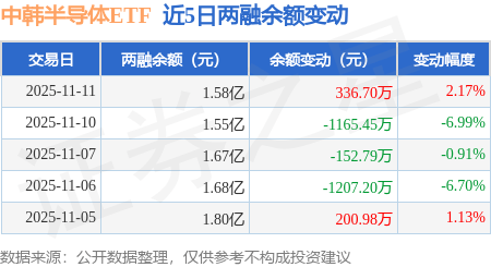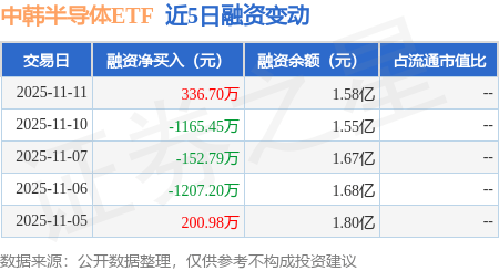 证券之星消息,11月11日,中韩半导体ETF(513310)融资买入1.47亿元,融资偿还1.44亿元,融资净买入336.7万元,融资余额1.58亿元。