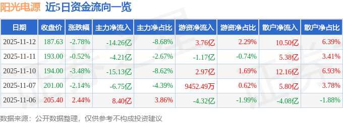 证券之星消息,截至2025年11月12日收盘,阳光电源(300274)报收于187.63元,下跌2.78%,换手率5.53%,成交量87.99万手,成交额164.35亿元。