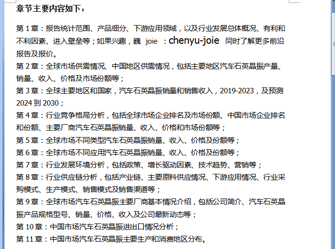 此外针对汽车石英晶振行业产品分类、应用、行业政策、产业链、生产模式、销售模式、行业发展有利因素、不利因素和进入壁垒也做了详细分析。