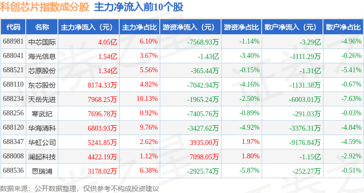 资金流向方面,科创芯片(000685)指数成份股当日主力资金净流入合计9781.32万元,游资资金净流入合计1761.06万元,散户资金净流出合计1.15亿元。成份股资金流向详情见下表: