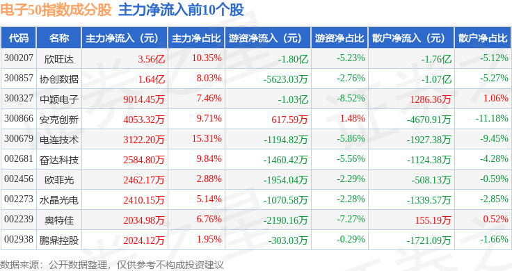资金流向方面,电子50(399281)指数成份股当日主力资金净流出合计9.49亿元,游资资金净流出合计1025.2万元,散户资金净流入合计9.59亿元。成份股资金流向详情见下表: