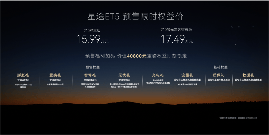 在预售期间,星途ET5为下定用户准备了总价值高达40800元的重磅福利,多项预售专属礼遇现已开启。包括下订1000元可抵3000元购车款、全系6000元置换补贴、价值28800元的猎鹰700辅助驾驶功能终身免费、专属4000元智能辅助驾驶无忧权益限时赠送(限210激光雷达智尊版)以及官方商城7kW智能家充桩半价尊享。同时,星途还为首任车主提供三大基础权益,包括终身免费基础流量,3年10G/月娱乐流量、整车终身质保及终身免费道路救援服务。