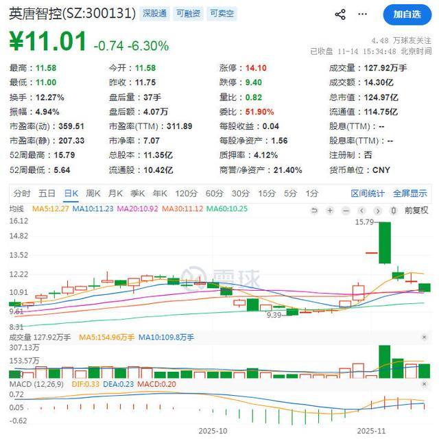 二级市场上,英唐智控于11月10日开市起复牌,正式复牌后,英唐智控股价走势先涨后跌,截至11月14日收盘,该股跌6.30%报11.01元/股,总市值124.97亿元。
