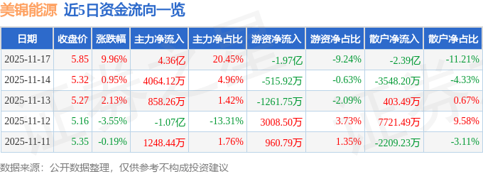 证券之星消息,美锦能源11月17日涨停收盘,收盘价5.85元。该股于13点46分涨停,7次打开涨停,截止收盘封单资金为2217.69万元,占其流通市值0.09%。