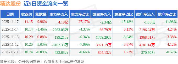 证券之星消息,精达股份11月17日涨停收盘,收盘价11.15元。该股于9点32分涨停,7次打开涨停,截止收盘封单资金为5247.43万元,占其流通市值0.22%。